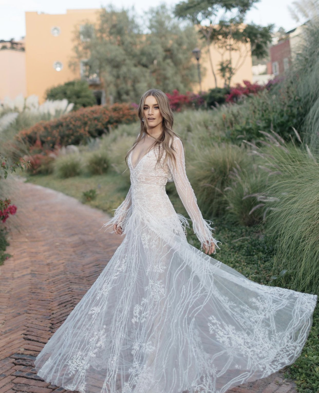Pelin is one of our iconic gowns made of lace, delicate beads and feathers! The perfect combination of daring and dreamy.